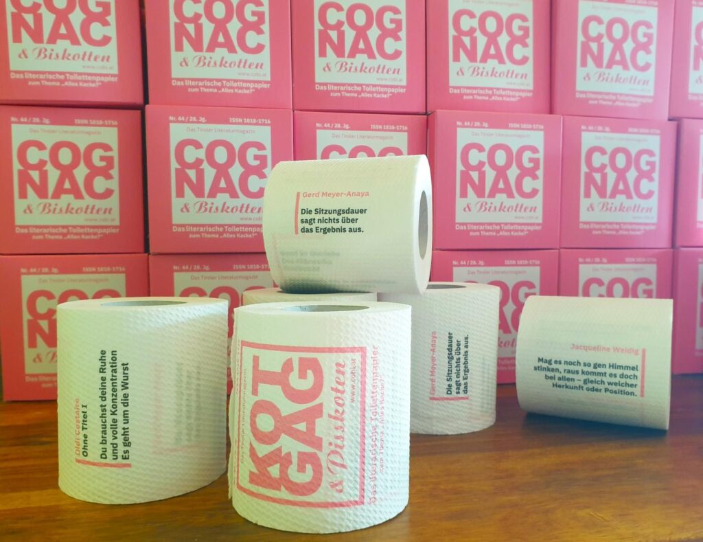 UPDATE 12.09.2025: Die Jury hat getagt, das Layout ist erstellt und soeben in Druck gegangen: Das literarische Toilettenpapier (Ausgabe Nr. 44 des Literaturmagazins Cognac & Biskotten zum Thema „Alles Kacke?“)! Präsentation: 23.10. Klärwerk Ibk dank IKB! Mehr dazu in Kürze. Und sorry an alle Autor:innen, bei denen es diesmal nicht geklappt hat. Hurrrrayyy an folgende 44 Auserwählten: Erika Altenburg (D), Marlies Blauth (D), Boarnvroni, Didi Costaire (D), Herta Dietrich (D), Julie Direnga (D), Anke Elsner (D), Jutta Engelhardt (D), Oliver Fahn (D), Daniel Furxer, Rene Gatterer, Anne Hechenberger (D), Hans-Ulrich Heuser (D), Silvia Hlavin, Claudia Hummelsheim (D), jott (D), Thomas Kade (D), Boris Kant (D), Bastian Kienitz (D), Markus Köhle, Michael Köhler (D), Bianca Körner (D), Sara Leitner, Katja Lißmann (D), Richard Loose (D), Karin Megla, Gerd Meyer-Anaya (D), Wolfgang Nöckler, Jochen Neuffer (D), Albrecht Rau (D), Martina Richards (D), Kaia Rose, Sigune Schnabel (D), Gabriele Schneider, Marec Béla Steffens (D), Stockkampf, Thorsten Trelenberg (D), Jacqueline Weidig (D), Katja Wilhelm, Rainer Willert (D), Claudia Winkler, Nikoletta Zambelis & Elisabeth Ziegler-Duregger